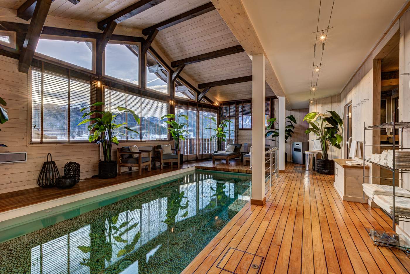 Chalet X is a beautiful large chalet finished to stunningly high standards. The facilities add the x-factor to make this one of the finest chalets in Morzine. The spacious open-plan living area offers panoramic views across the valley, and the plush sofas nestled around the open fire make an idyllic setting for relaxing with a glass of wine after an active day on the slopes. The dining and kitchen bar area share wonderful views and atmosphere with the spacious lounge, perfect for hearty breakfasts or sumptuous meals cooked by your professional chef. The seven bedrooms have been lovingly finished with soft furnishings and contemporary lighting. Five of the bedrooms have en-suite shower rooms, the remaining two bedrooms share a shower room. The chalet comfortably sleeps 12 guests but with 2 sets of bunk beds and 2 beds on a mezzanine floor, it can accommodate up to 18 guests. The spa area is located on the ground floor with a steam room, sauna, and indoor swimming pool. The mezzanine above houses an extensive cardio fitness suite. The pool area and gym suite are the ideal places to relax after skiing. The wonderful wrap-around south-facing terrace with its outdoor hot tub is the ideal spot to take in the stunning views or catch a few late afternoon rays. A cozy outdoor heated snug area adds to the après ski fun of the chalet, ideal for watching the sunset whilst sipping one of the TG Ski signature cocktails/mocktails. Chalet X is a stunning chalet with all the extras you and your guests could need for the perfect holiday. The flexible room configurations make it ideal for families, larger groups, or corporate stays.