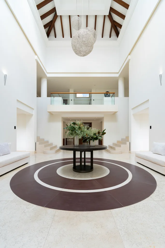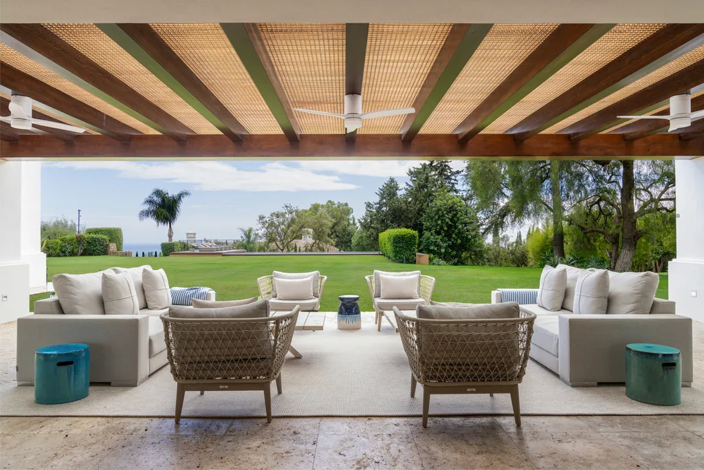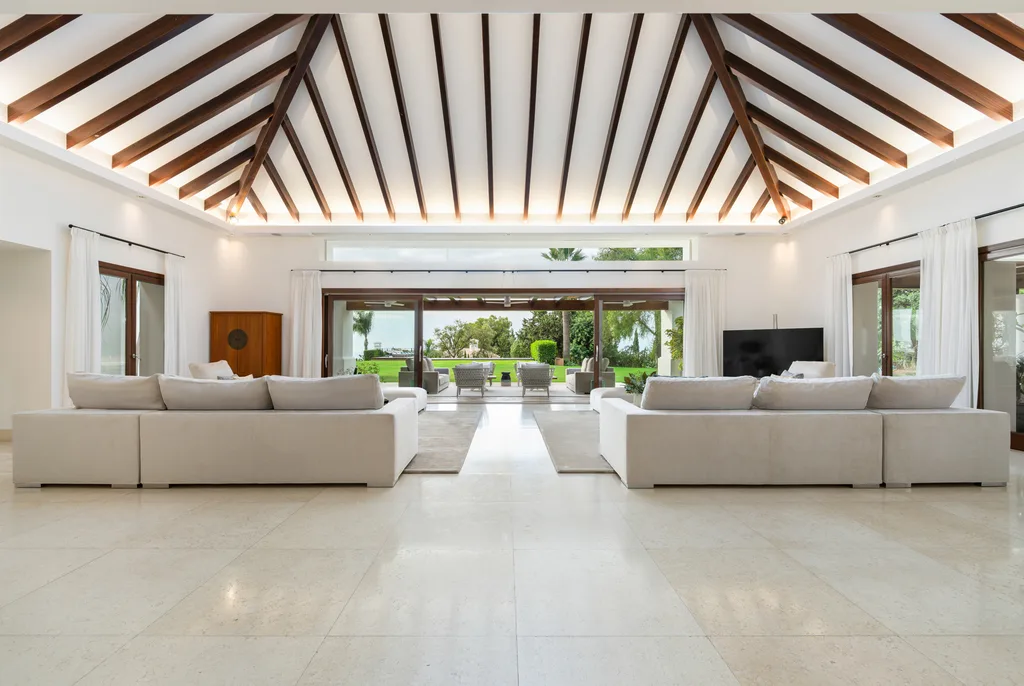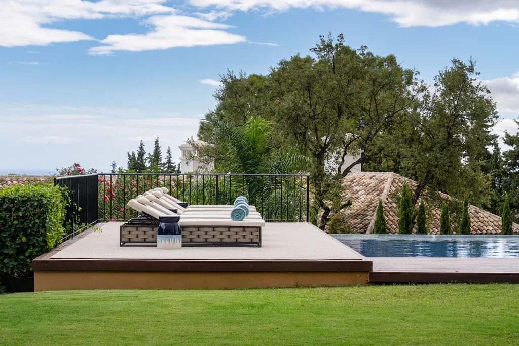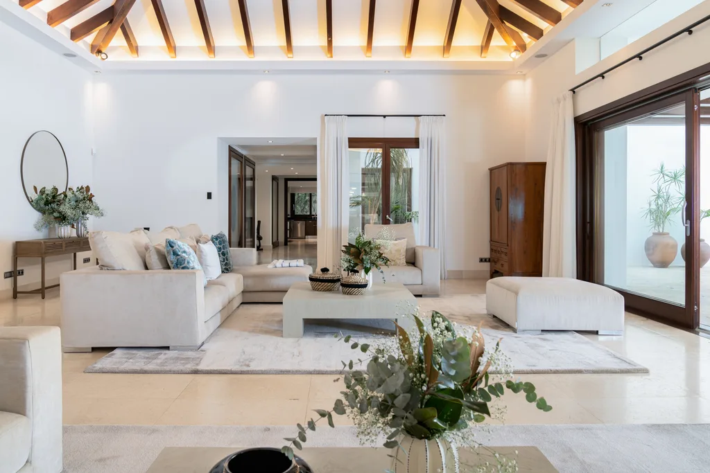 Villa Lannister, is in the fancy area of Cascada de Camoján" near La Concha mountain. It offers stunning views of Marbella's coastline and has a modern design with top-notch quality. It's a luxurious family home with a smart automation system controlling various features. The property's elegant atmosphere is enhanced by rustic marble floors