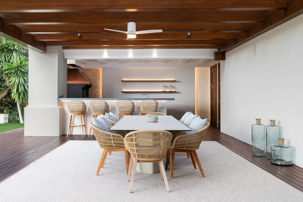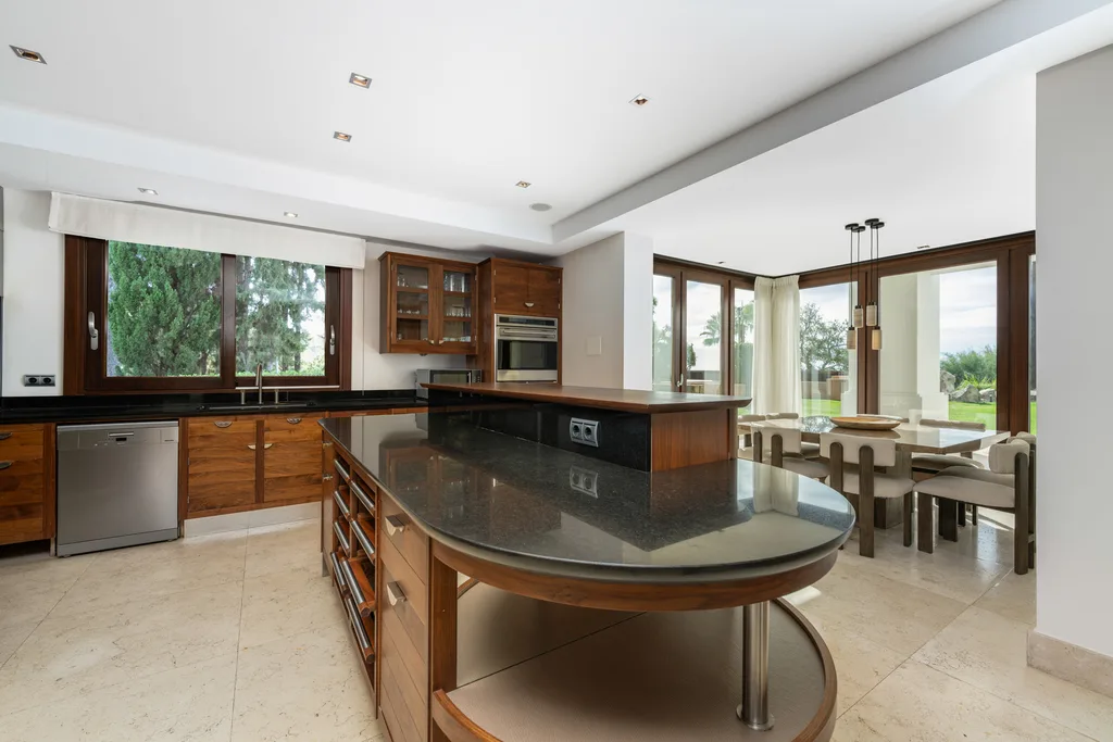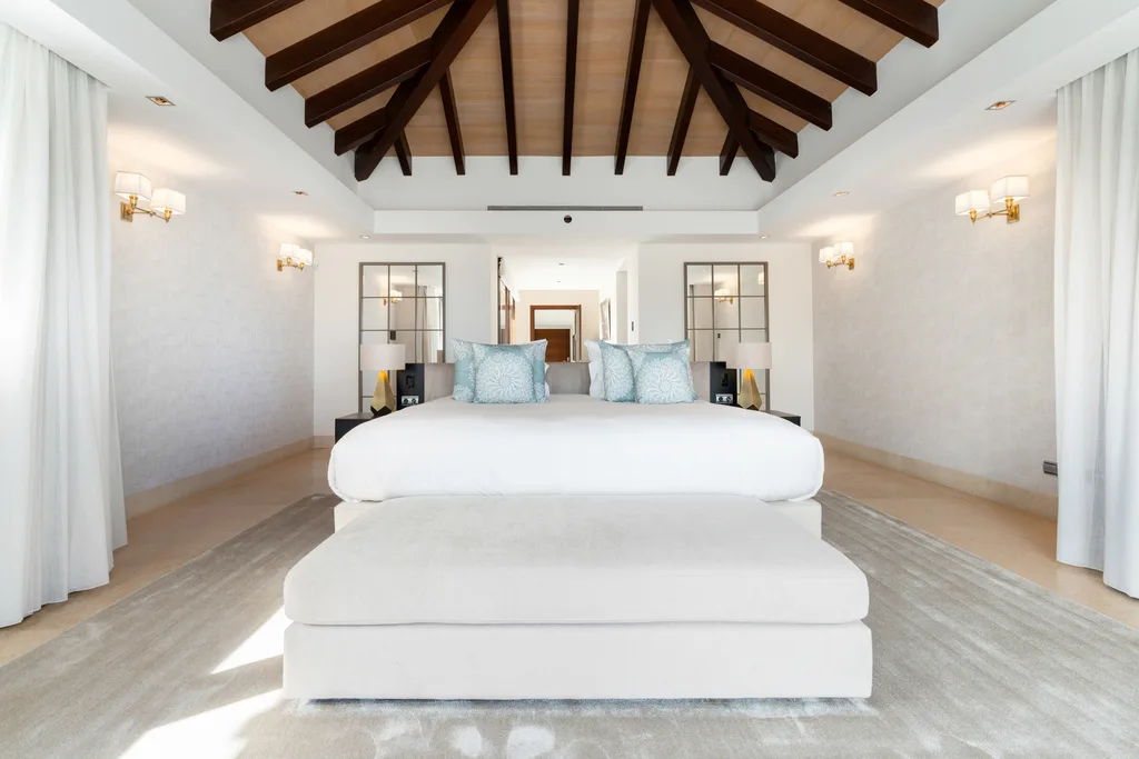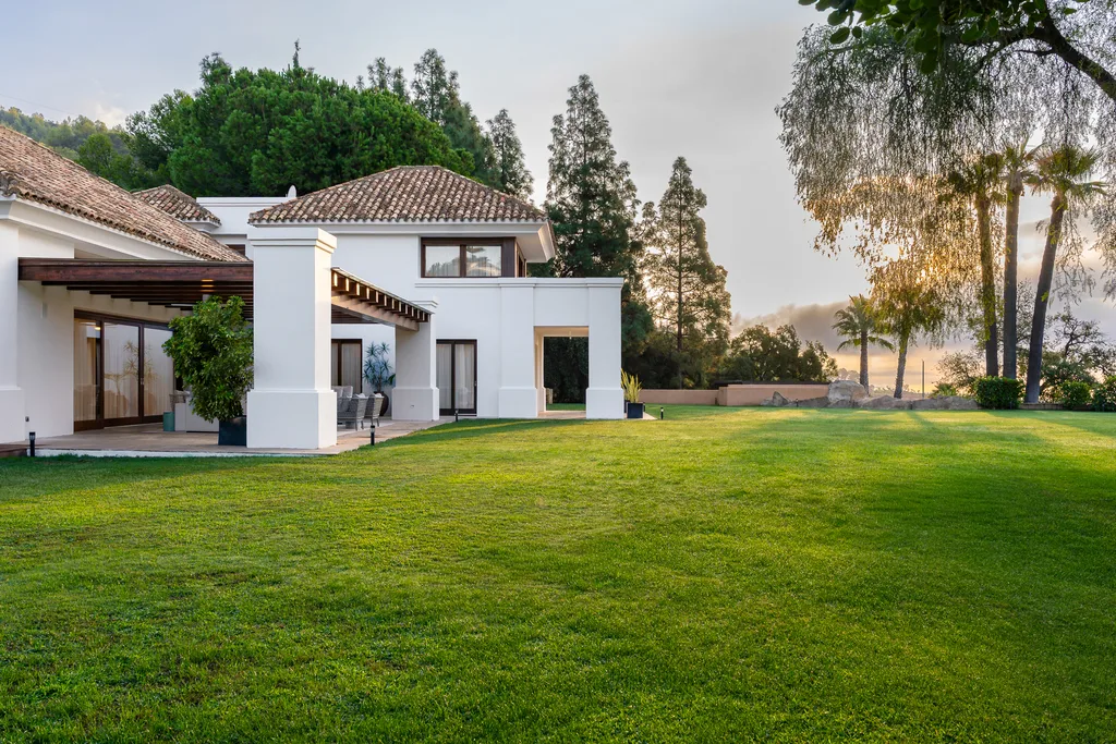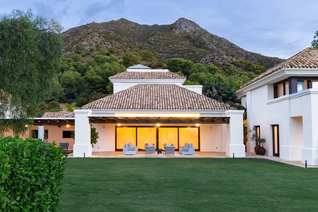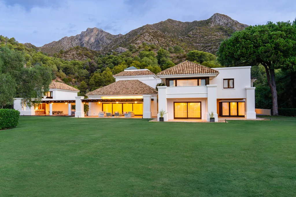 Villa Lannister, is in the fancy area of Cascada de Camoján" near La Concha mountain. It offers stunning views of Marbella's coastline and has a modern design with top-notch quality. It's a luxurious family home with a smart automation system controlling various features. The property's elegant atmosphere is enhanced by rustic marble floors
